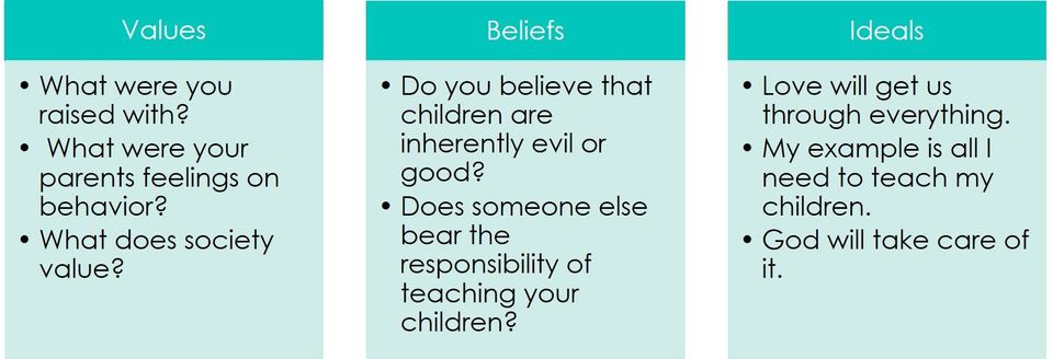 - Teach by example . We must first have our life in order so that our children will grow up with the values we want them to have
